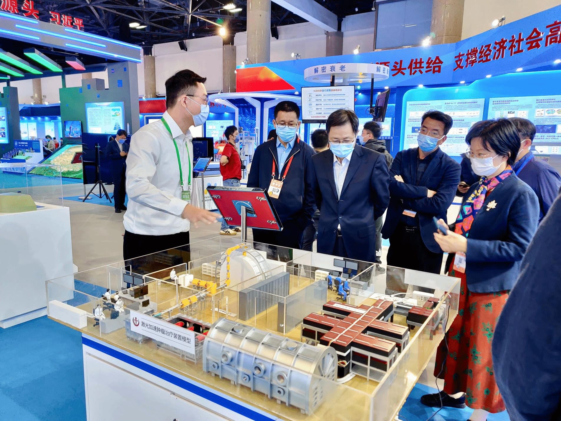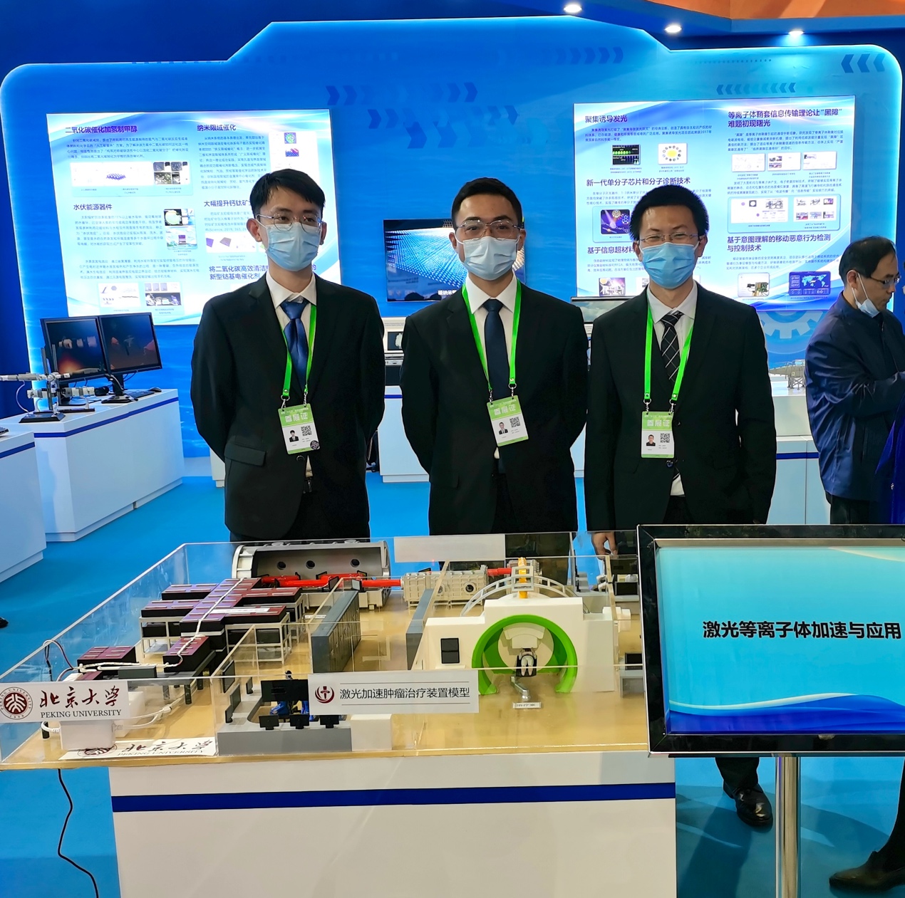 2021年10月27日,为期一周的国家“十三五”科技创新成就展在北京展览馆闭幕。北京大学物理学院激光等离子体实验室参与的研究成果“激光等离子体加速及应用”成功入选,并在“加强基础前沿研究,提升科技源头创新能力”的展区以装置模型亮相。实验室博士生李昱泽、吴学志、彭梓洋负责了北京大学激光加速肿瘤治疗装置模型的准备和现场的解说。