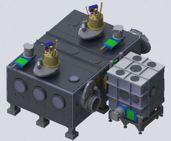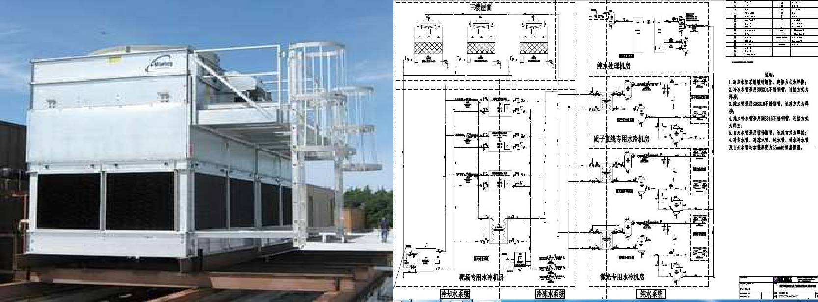 图 4 治疗头腔体、治疗室剂量分布模拟、冷却塔以及实验室水冷系统进展情况