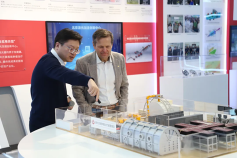 首先,马文君教授代表北京激光加速创新中心对Ferenc Krausz教授的到来表示热烈欢迎。随后在中心的展厅内,向Ferenc Krausz教授介绍了中心的建设历程及发展定位,着重展示了我国自主研发的、具有国际领先水平的拍瓦激光加速质子肿瘤治疗系统,Ferenc Krausz教授对此产生了浓厚的兴趣,认真听取马文君教授对于该系统的原理、功能及其在临床治疗肿瘤方面的介绍,并对未来有望为肿瘤放疗领域带来变革性的技术推动表示欣喜。北京激光加速创新中心的建设发展正稳步推进,它将为辐射医学、前沿物理、核能持续、先进材料等领域重大科学问题研究提供条件。